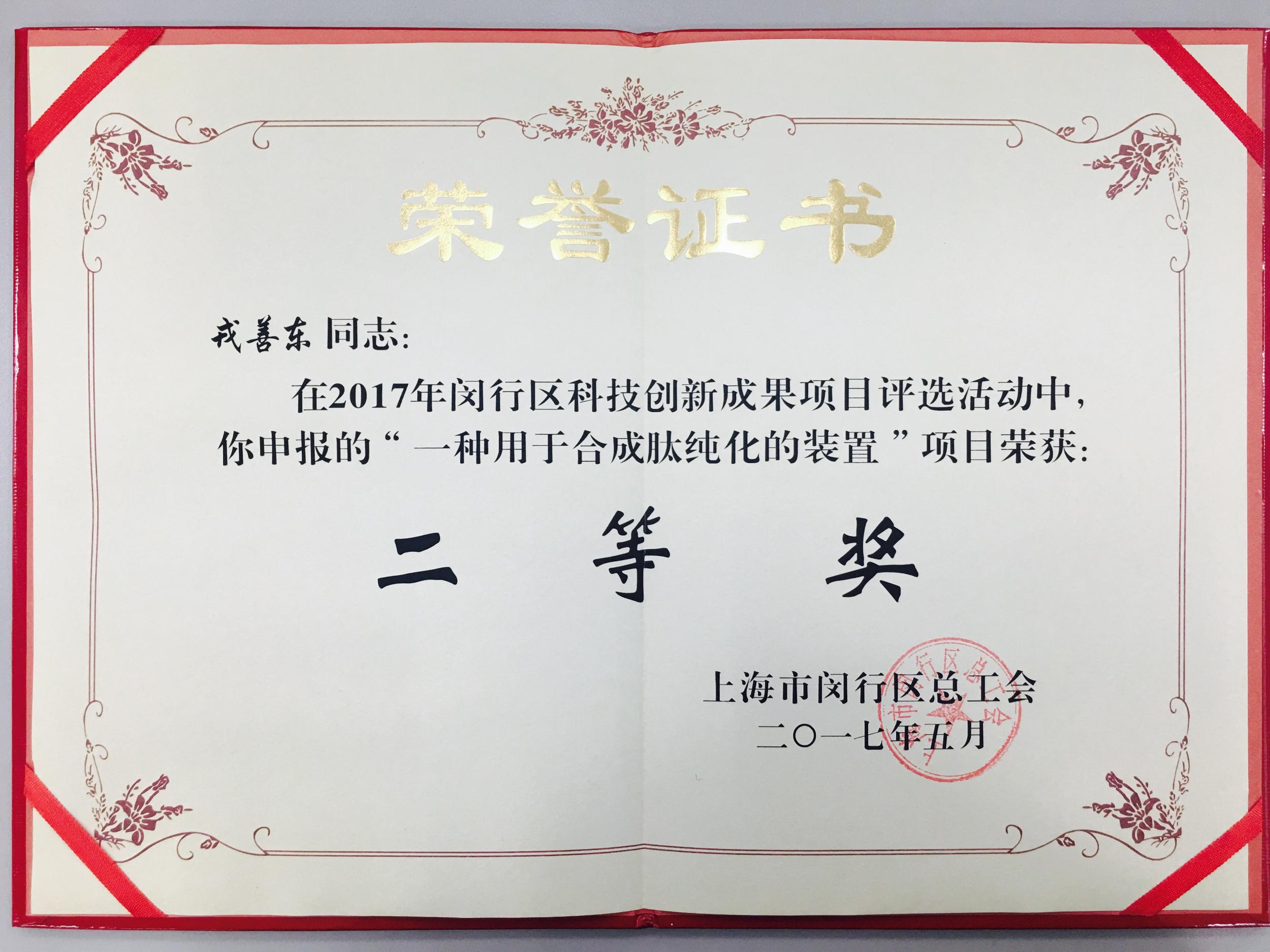 其中:戎善东申报的《一种用于合成肽纯化的装置》项目荣获“二等奖”